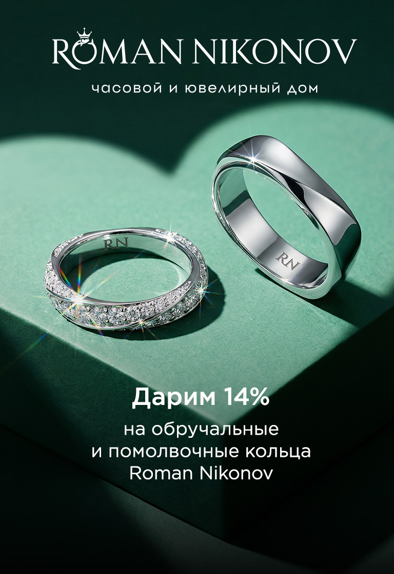 В честь Дня всех влюбленных мы дарим 14% на обручальные и помолвочные кольца Roman Nikonov.