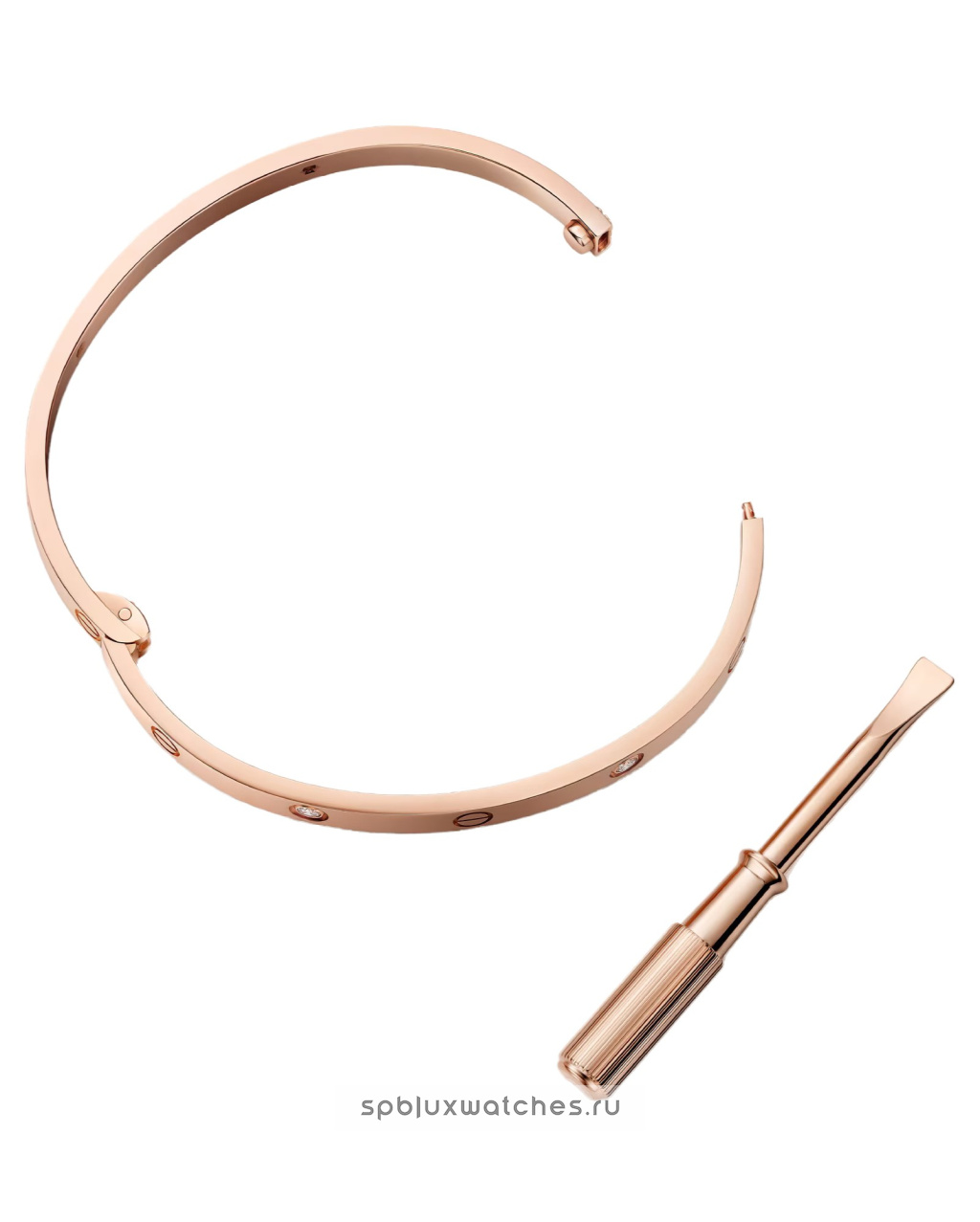 Браслет выполнен из розового золота 750-й пробы, украшен 4 бриллиантами круглой огранки весом 0.19 карата