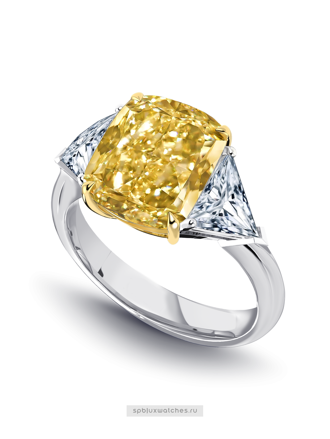 Кольцо выполнено из белого и желтого золота 750-й пробы, украшено тремя лабораторными бриллиантами общей массой 6.33 карат