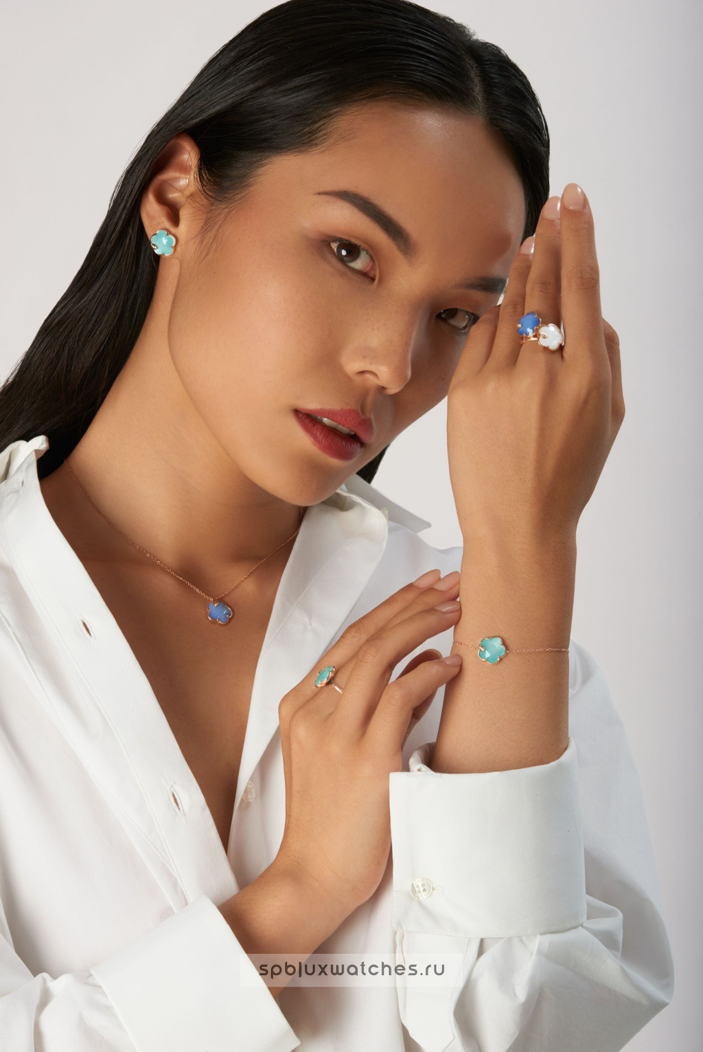 Розовое золото 750-й пробы, бриллианты 0.01 карата, белые лунные камни с зеленым агатом, перламутром и ониксомПод заказ