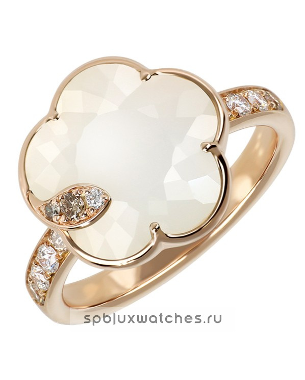 Розовое золото 750-й пробы, белые бриллианты - 0.12 карата, бриллианты цвета шампань - 0.13 карата, белый лунный камень и перламутрПод заказ