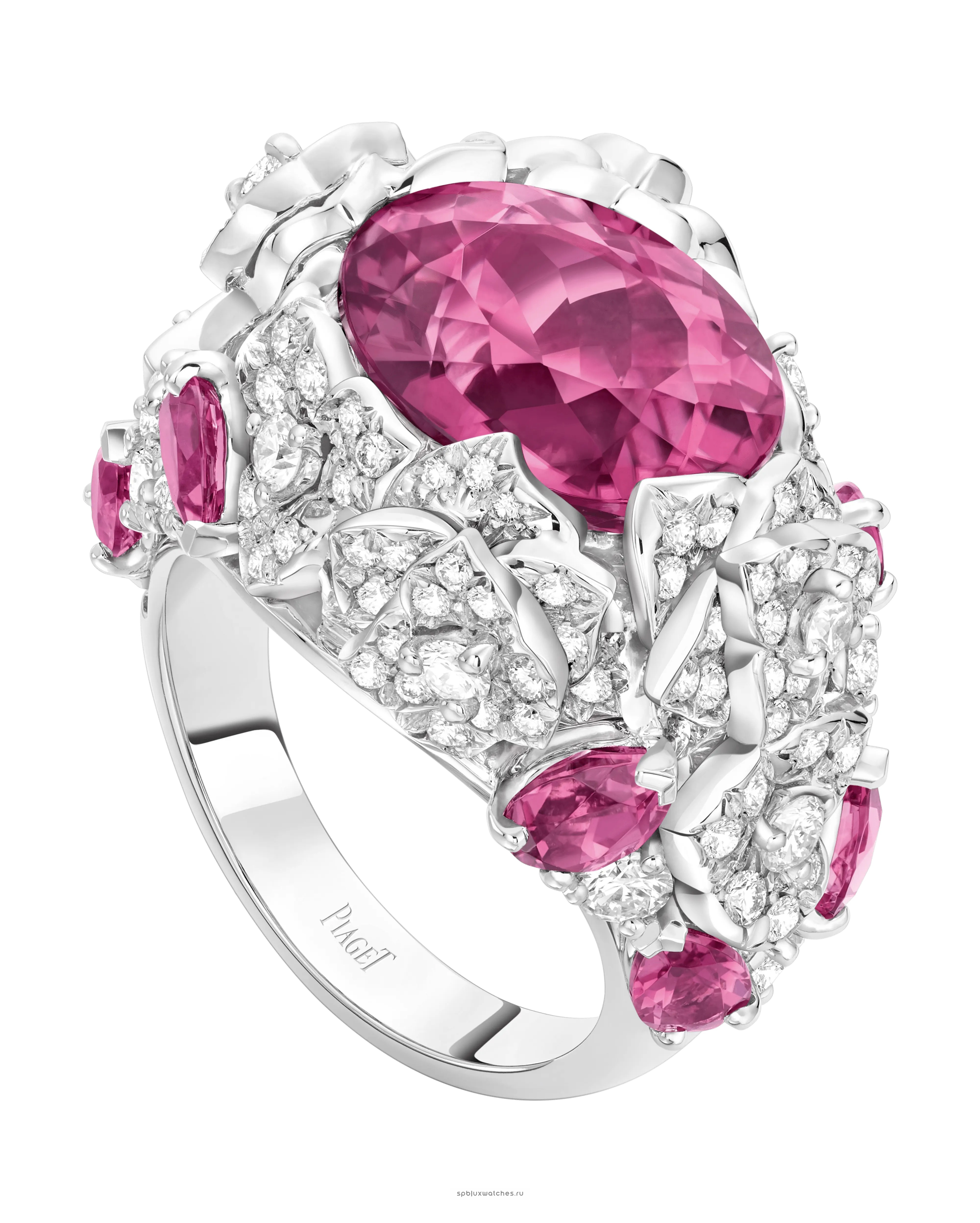154 белых бриллиантов ~ 1.76 карата, розовый турмалин овальной огранки ~ 4.92 карата, 8 розовых турмалинов ~ 1.38 карата -