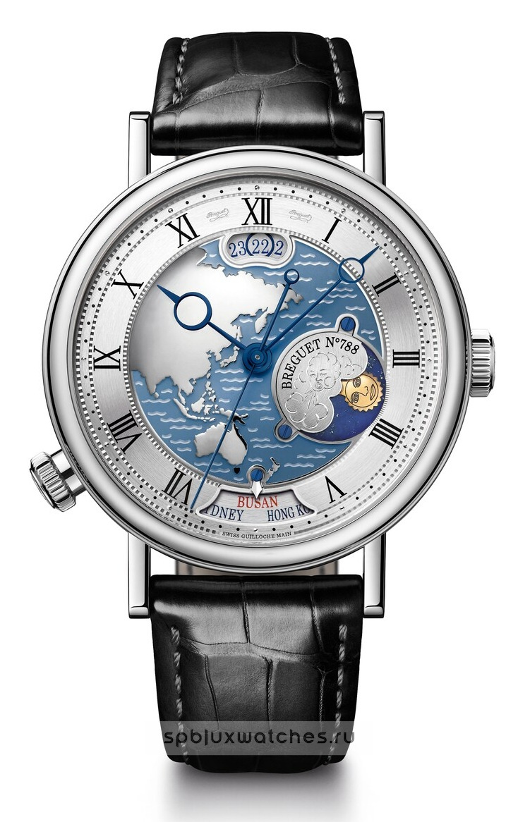 В классических часах Breguet Hora Mundi 5717 можно заказать изображение одной из частей света (Америка, Европа или Африка, Азия или Океания) – всего шесть вариантов. Интересное изобретение Breguet, часовое усложнение, впервые в мире примененное в этой модели, заключается в мгновенной индикации времени второго часового пояса, синхронизированной с указателями даты, времени суток и города.