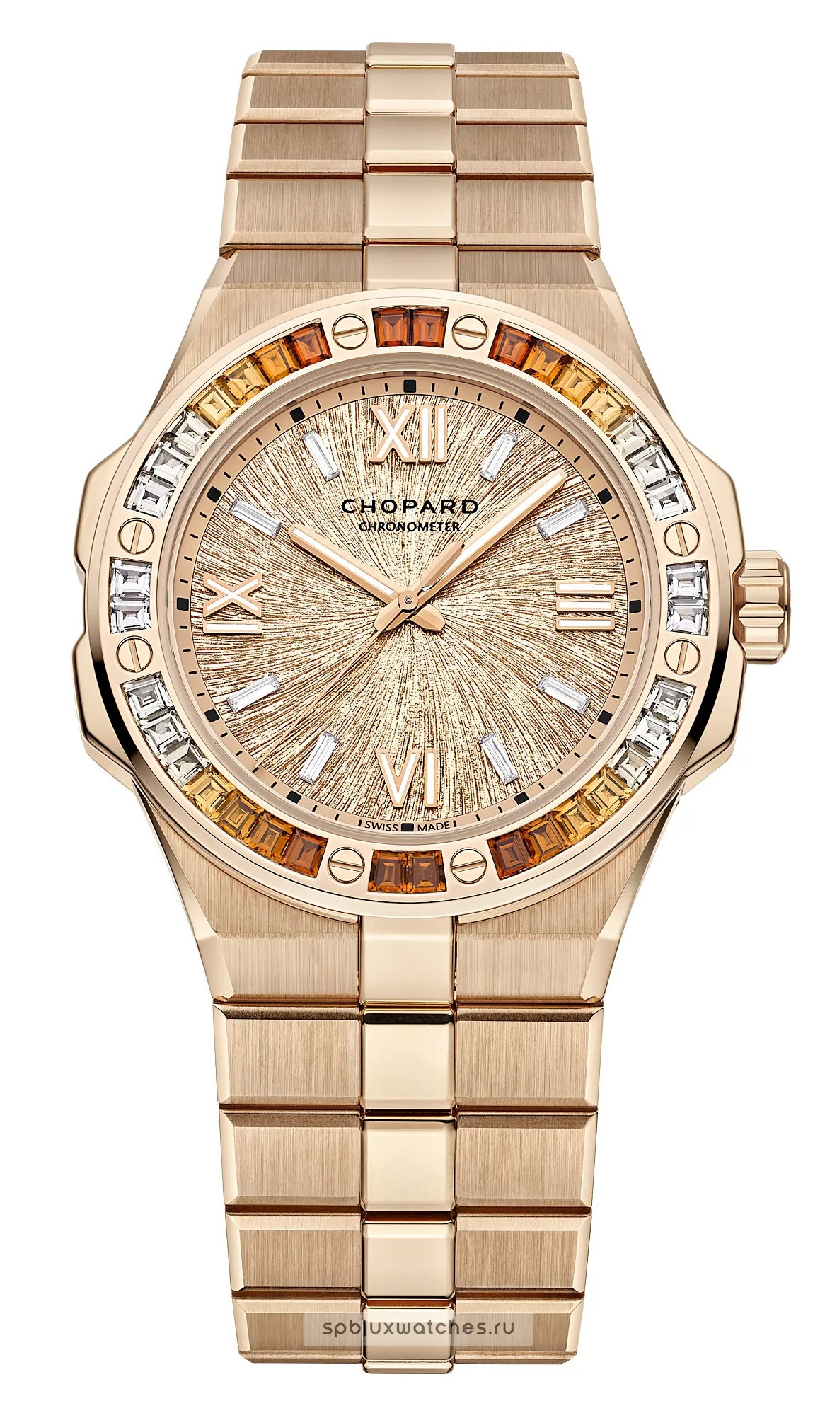 Гальваническое покрытие цвета «Pink Dawn» – заключительная отделка с эффектом радужной оболочки орлиного глаза – часовые метки с бриллиантами багетной огранки -