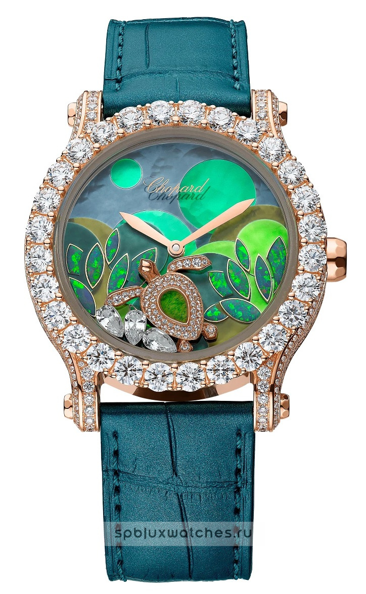Сине-зеленый циферблат украшен фигуркой черепахи из розового золота, инкрустированной бриллиантами.