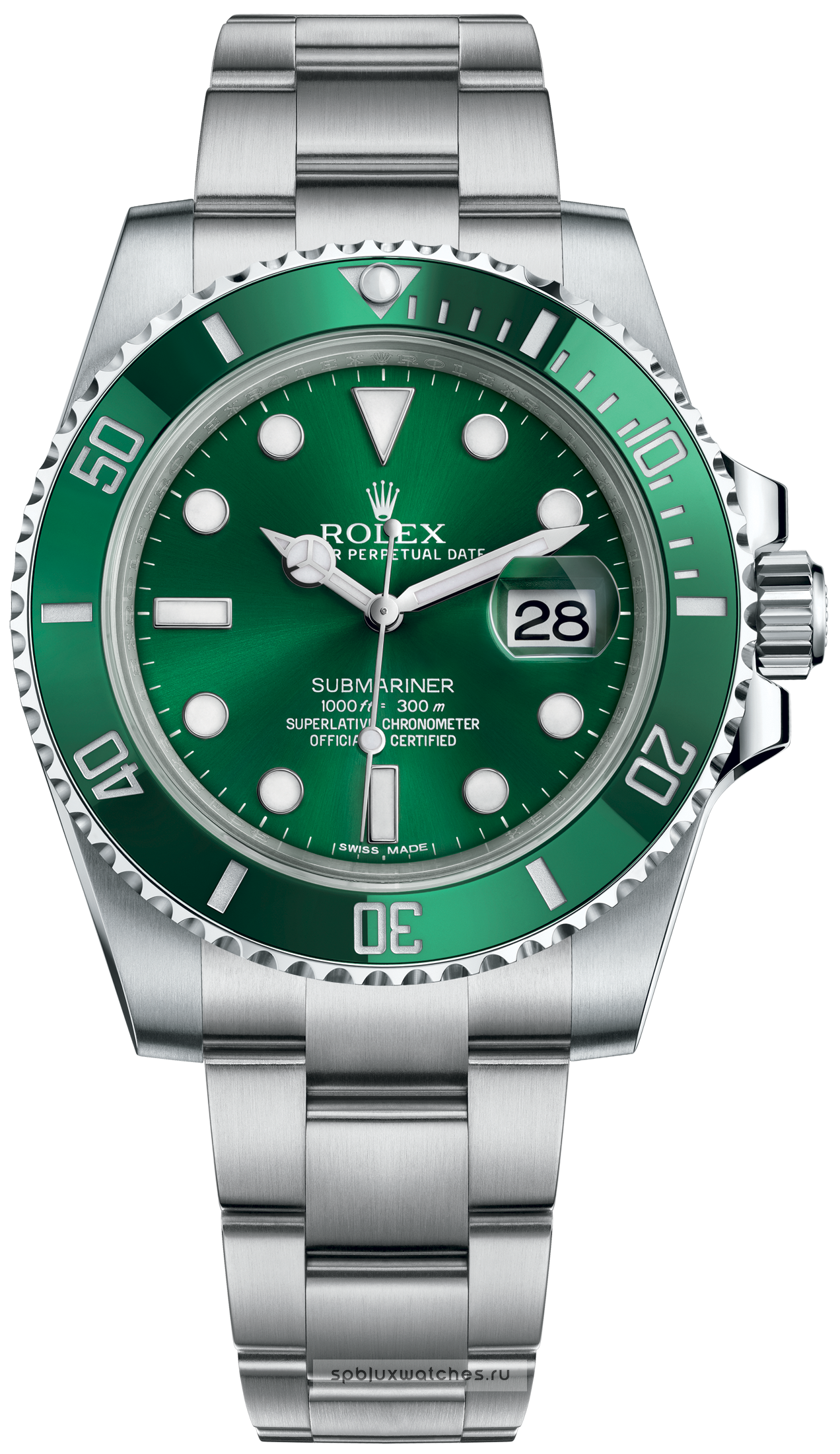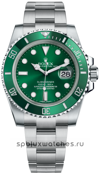 Rolex Submariner Date 116610LV Hulk - одна из самых популярных моделей швейцарской мануфактуры Ролекс. Благодаря великолепному корпусу Oyster, выразительному зелёному циферблату с крупными светящимися часовыми отметками, а также вращающемуся градуированному безелю Cerachrom и прочному браслету Oyster, новейшее поколение часов Submariner и Submariner Date возрождает традиции исторической модели, выпущенной в 1953 году. Компания Rolex производит часовые корпуса из нержавеющей стали 904L, которая используется в сфере высоких технологий, космической и химической промышленности, где требуется максимальная стойкость к коррозии. Суперсплав 904L отличается исключительной прочностью и превосходно поддается полировке. Сделанный из него корпус сохраняет первоначальную красоту даже в экстремальных условиях эксплуатации. Часы Rolex Submariner Date M116610LV-0002 оснащены мануфактурным механизмом Rolex калибра 3135, сертифицированным COSC. Запас хода часов Rolex Submariner Date 116610 составляет 48 часов, водонепроницаемость - 300 метров. Браслет оснащён застежкой безопасности Oysterlock с раскладывающейся пряжкой и системой удлинения Rolex Glidelock.